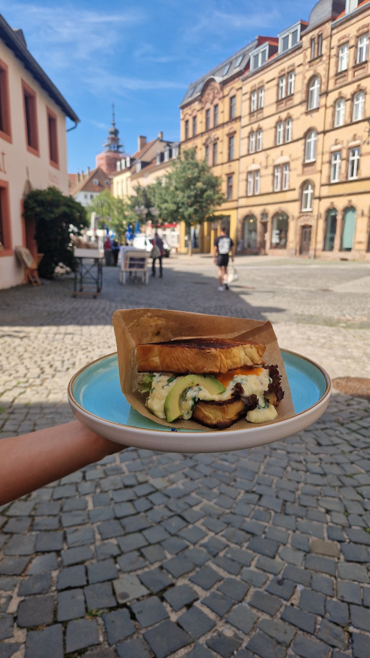 Cremiges Rührei mit Schnittlauch und Gouda, zwischen zwei in Butter gebackenen Briochescheiben, Salatblatt, Sriracha, Mayonnaise